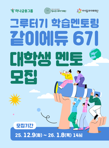 그루터기 학습멘토링 같이에듀 대학생 멘토 6기 모집 SPECIAL IDEA분류 : 광고/마케팅, 예체능/미술/음악, 대외활동/서포터즈, 봉사활동, 취업/창업, 기타아이들과미래재단D-26 접수중7,266